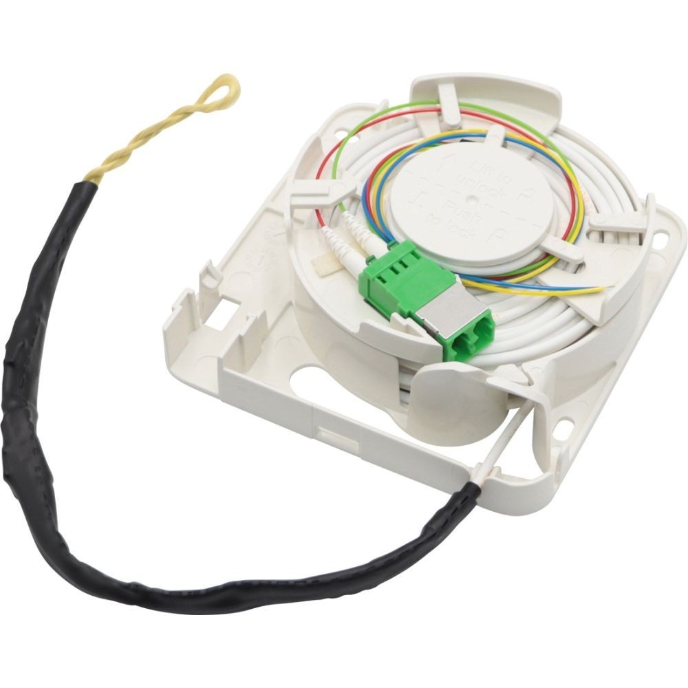 • Glasfaser-Teilnehmeranschlussdose mit beidseitig vorkonfektionierten LC/APC Steckern (Grade B) für den Einsatz vom Gf-AP/HÜP oder Etagenverteiler (EV)bis in die Wohnung