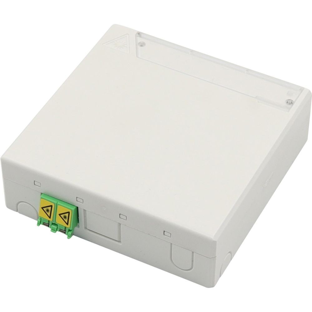 Glasfaser-Teilnehmeranschlussdose mit einer Aufnahmekapazität von max. 2x LC-Duplex oder 2x SC-Simplex Kupplung mit klappbarer, herausnehmbarer Spleisskassette für max. 4 Spleisse für Krimp- oder Schrumpfspleissschutz und geordneter Faserführung unter der Spleissablage.